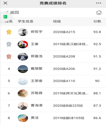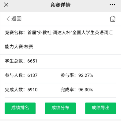 此次大赛全程采用线上竞赛模式,设置多种词汇题型,随机出题,竞赛平台综合学生答题分数和答题时间进行排名。本次参赛学生以2019级和2020级学生为主,在线注册6651人,共计6137人参加,5910人完成比赛,参与率为92.27%,完成率为96.30%。校赛成绩排名前200的学生直接晋级省赛,由平台直接推送复赛邀请给晋级学生。按照德州扑克