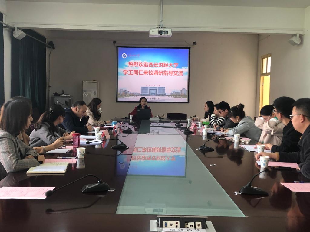 4月27日上午,西安财经大学学工部副部长孔燕、心理中心专职教师、各院系心理专干一行11人来校调研交流,座谈会在鄠邑校区行政楼203室召开。学工部副部长刘笛、学生心理成长指导中心主任肖琼、心理中心全体教师和院系心理专干代表参加了会议。