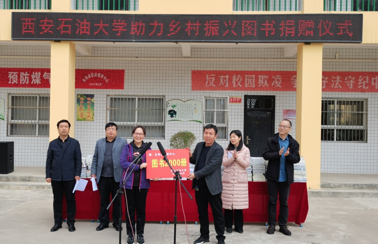 助力乡村振兴图书捐赠仪式在永寿县职业教育中心举行。校工会主席袁玎、工会副主席刘陕军、图书馆副馆长孙琳、永寿县政府教育督导室副主任黄健身、永寿县职业教育中心校长李茂茂出席了捐赠仪式。