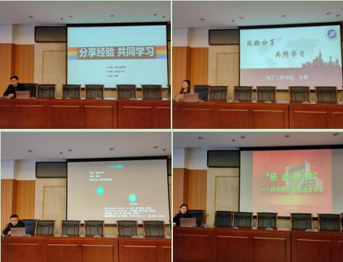 会上,屈航同学就个人规划及硕士期间的学习情况进行分享,帮助同学们更好的把握时机。他建议同学们要积极参加各类竞赛,努力做好科研,做到有毅力、有规划、不盲从,有技巧。随后,李野同学着重分享了自己在论文写作,学科竞赛过程中的心得体会。她不仅为同学们提供了一些研学小技巧,同时推荐了一些常用的相关咨询公众号、网站等供大家参考。吴娟同学就学习方法、论文写作、生活与工作等方面为学弟学妹进行了提纲挈领的分析。她激励学弟学妹们脚踏实地,奋发向上,努力成为下一个国家奖学金获得者。孙浩男同学以自己的成长经历为时间轴,分享了从研究生入学初的迷茫,到科研学习柳暗花明的过程。他强调,在丰富个人履历时要兼顾自身兴趣和个人经历的匹配,这样个人的核心竞争力才会更明确。