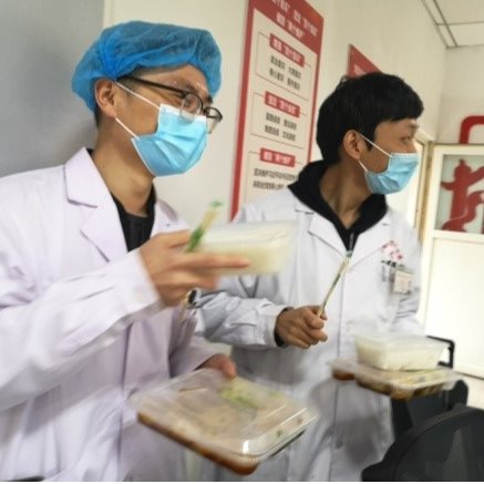 医务人员利用午餐时间,各小组抓紧总结新冠疫苗接种中需要注意的事项
