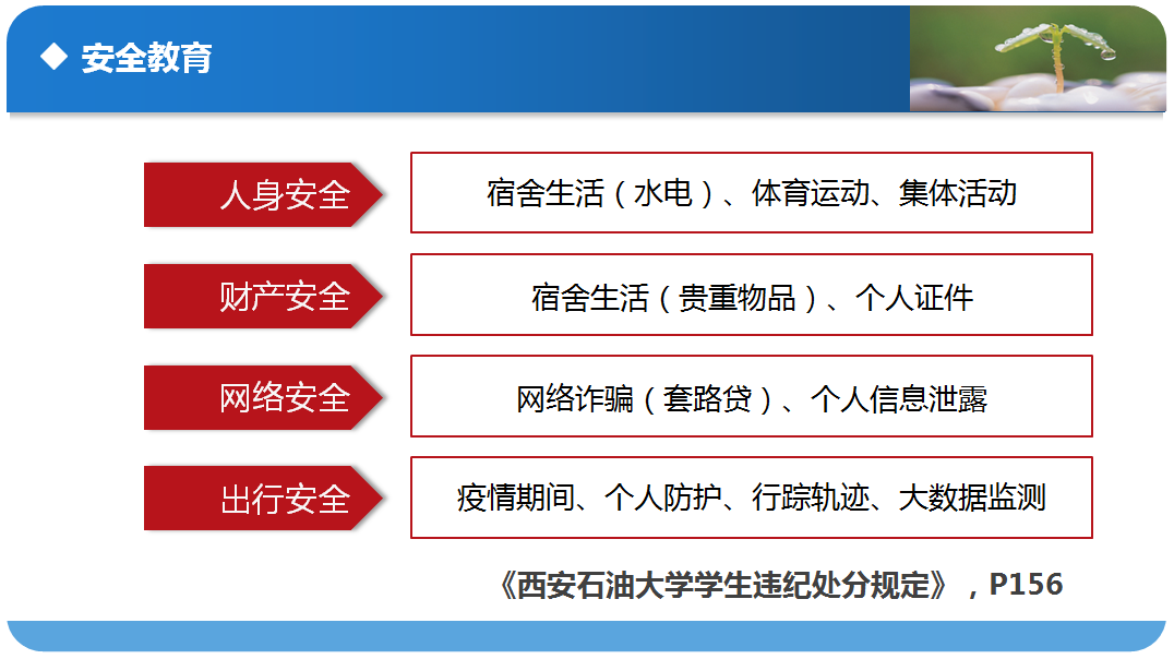 接着,李老师结合本学期返校后疫情防控期间的管理要求,从人身安全、财产安全、网络安全、出行安全四个方面,以关键字和具体事例的相互串讲,给大家上了一节实例满满的安全教育课,在重点时间节点,再次提醒全体学生安全无小事、安全系大家,只有牢固树立安全意识,才能为祥和的校园生活提供保障。