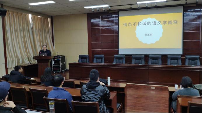 邀请,西安外国语大学外国语言文学研究中心徐玉臣教授在雁塔校区第五会议室带来了题为“情态不和谐的语义学阐释”的学术报告。院长于艳英、副院长刘辉、副院长陈武及全体教师和MTI研究生参加了本次学术报告会。报告会由刘辉副院长主持。