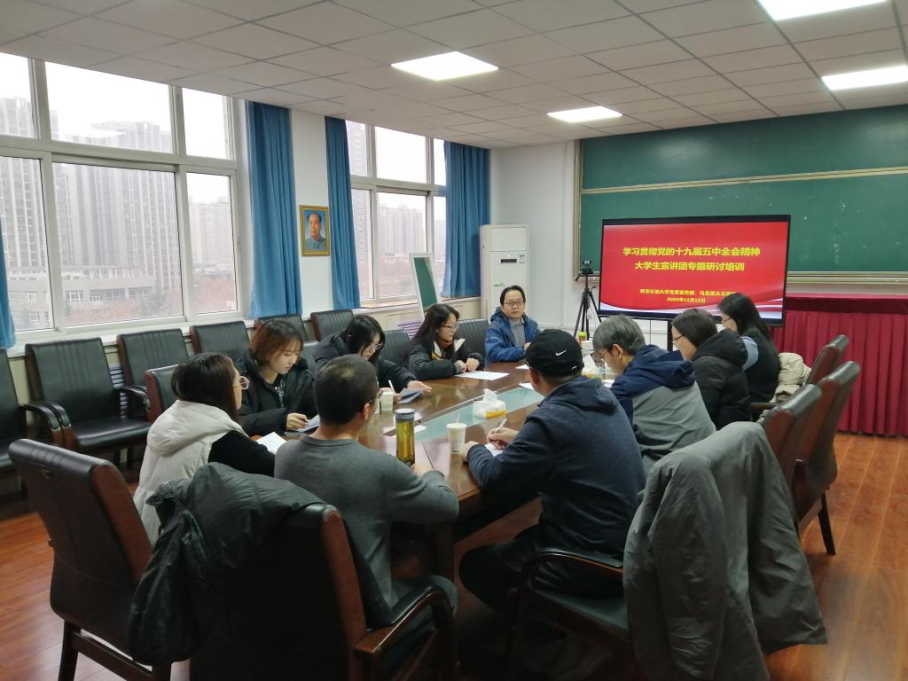 举办了学习贯彻党的十九届五中全会精神大学生宣讲团专题培训会,会议采用腾讯会议线上线下相结合的方式在雁塔校区1#818、鄠邑校区经管人文楼325室同时召开。大学生宣讲团全体成员和各小组指导教师参加了会议。本次会议由德州扑克