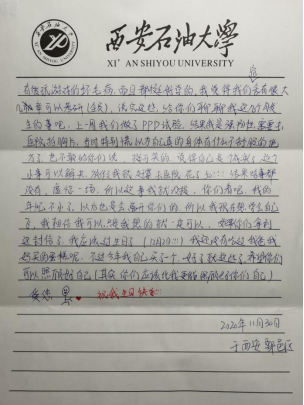 2020级辅导员李昱昊在总结活动时强调:社会在不断发展,时代在不断进步。越来越多的人通过语音视频等方式向亲人表达问候,但其实这种方式会有许多感恩的话语难以用语言表达,本次活动旨在于引导大家通过传统的书信加深与父母及亲友的情感沟通,懂得体会父母的不易,懂得父母的辛苦付出和默默承担,培养大家的感恩意识、责任意识、独立人格。