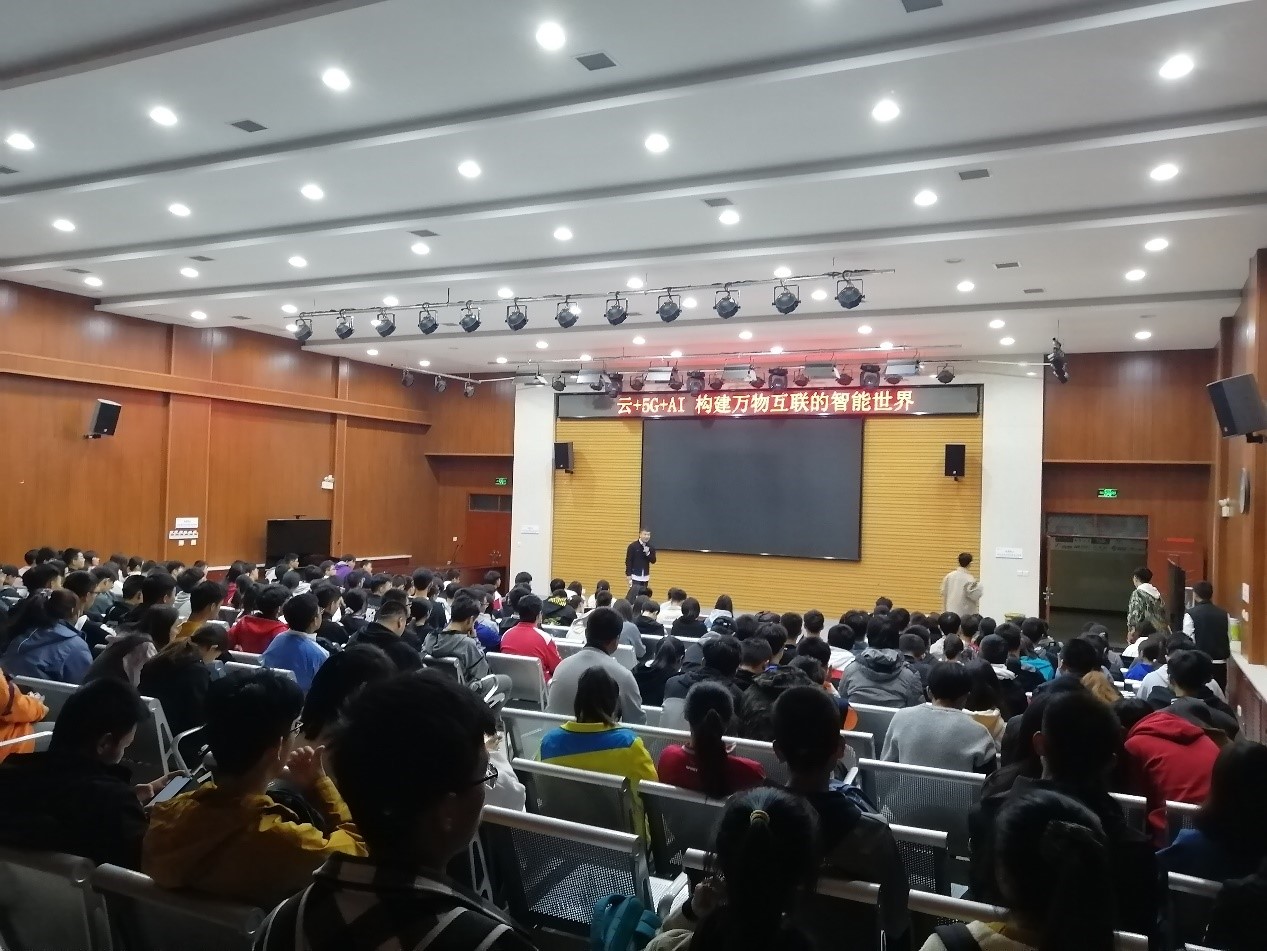 邀请华为云开发者生态运营师赵杰在鄠邑校区经管人文楼118室举办题为“云+5G+AI构建万物互联的智能世界”的学术报告会,辅导员王天航、刘亭普及200余名学生参加。