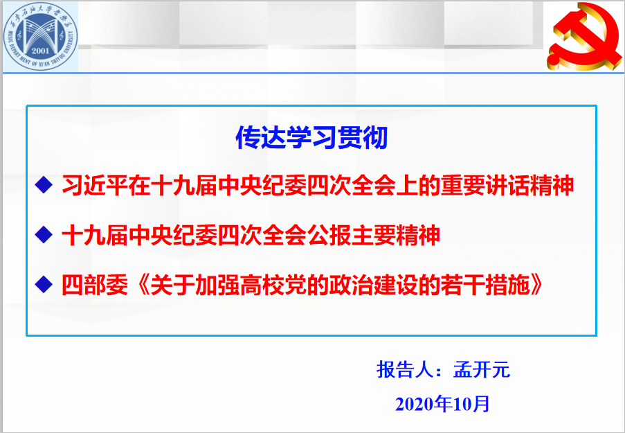 10月23日,音乐系党总支在系四楼党员活动室召开教工党支部、学生党支部学习会议,传达学习贯彻习近平总书记在十九届中央纪委四次全会上的重要讲话精神、十九届中央纪委四次全会精神和四部委《关于加强高校党的政治建设的若干措施》,进一步推进音乐系全面从严治党工作。音乐系党总支书记孟开元主持学习会。