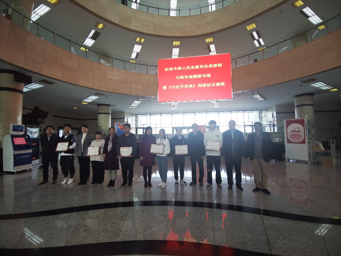 为落实习近平总书记坚定文化自信,推动社会主义文化繁荣兴盛,大力推进全民阅读推广工作,进一步传承和弘扬抗美援朝英雄精神,10月21日上午,我馆在新校区图书馆二楼大厅举办抗美援朝70周年馆藏图书展暨《习近平用典》阅读征文颁奖仪式。图书馆张伟、孙琳副馆长,学生工作部(处)李强副部(处)长、机械工程德州扑克