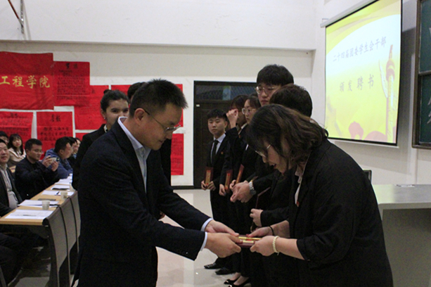 二十三届团委学生会年度工作报告。同时,李刚老师对上年度工作进行总结,并宣读了第二十四届院团委学生会主要学生干部的任免决定。接着,与会领导老师向新一届学生干部颁发了聘书。