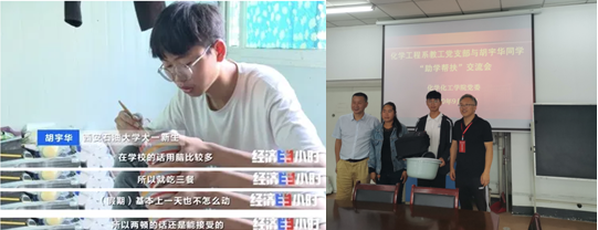 党委,拟启动支部与胡宇华同学的对口“助学帮扶”活动,希望通过化工系教工党支部的力量,给予该同学大学四年期间学业生活持续帮扶,使其在学业上能取得更大的成就,以此来回报父母、回报社会。