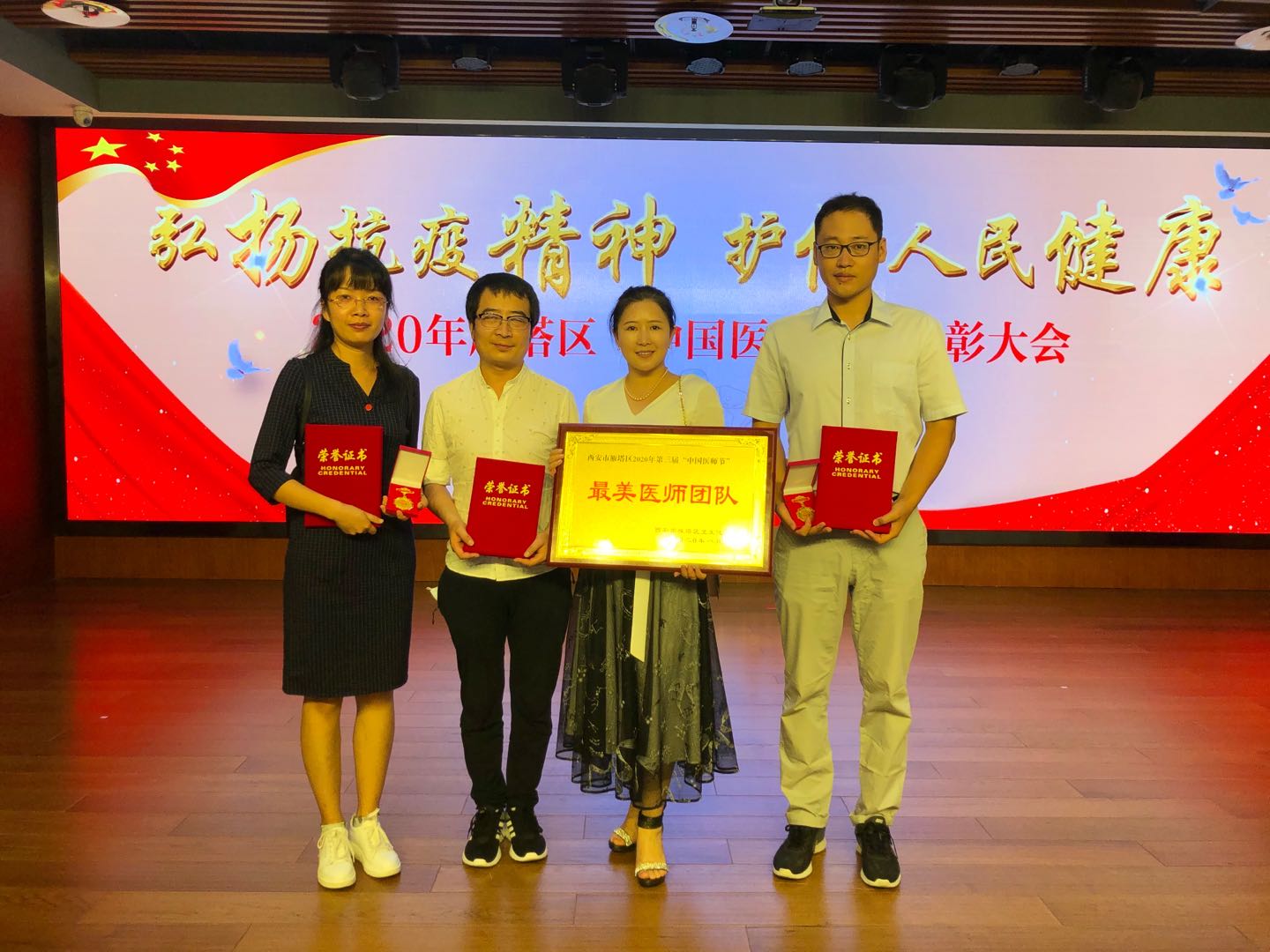 8月19日下午,为隆重庆祝2020年第三届“中国医师节”,雁塔区举办了以“弘扬抗疫精神,护佑人民健康”为主题的表彰大会。校医院门诊部丁丽主任和医师赵利剑、洪艳萍、姚刚代表校医院参加了此次颁奖活动。