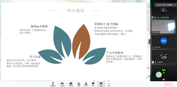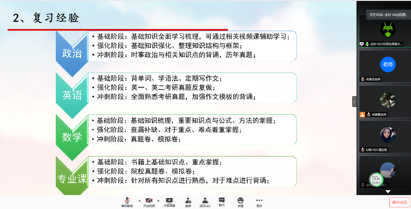 、专业、导师选择、复习方法、知识拓展及资源利用等主题,并结合自身经历及体会纷纷建言献策,有针对性地给同学们提出了许多中肯的意见和建议。