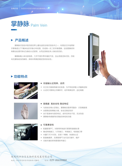 陕西利丰恒信生物科技发展有限公司成立于2017年,是西北地区最早拥有掌静脉识别技术,并成功推广到行业应用的科技创新型单位。公司地址位于西安市高新区,拥有包括掌静脉识别、指静脉识别、人脸识别、指纹识别等国内外先进的识别专业技术。公司致力于先进的生物识别技术的集成、开发和应用,为不同行业不同需求的客户提供整体解决方案,尤其在司法公安系统中结合实际管理情况和应用需求,不断完善、创新推出具体可行的解决方案,得到各合作单位的一致好评。目前公司业务遍及陕西、四川、广东、海南、广西等省市。