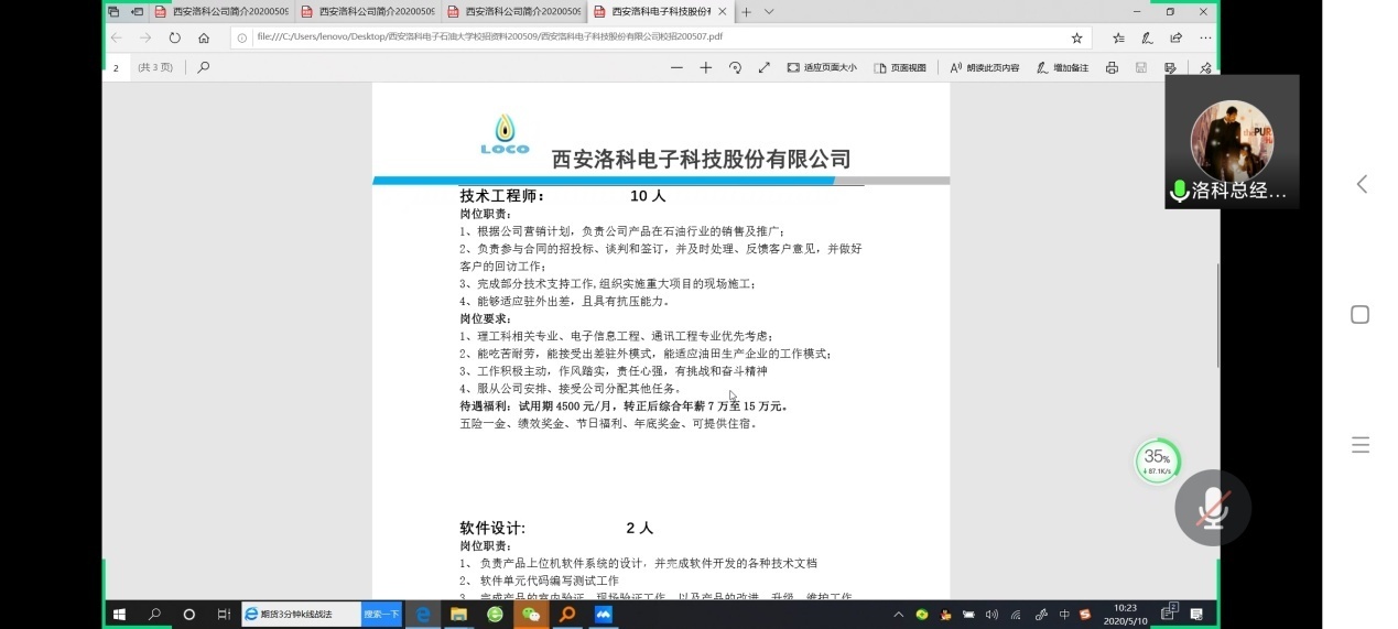 西安洛科电子科技股份有限公司总经理兰孟平结合PPT,向参会毕业生宣讲介绍了洛科公司的发展史、经营理念、德州扑克、业务范围、招聘需求等情况,重点介绍了不同岗位的工作性质、福利待遇、工作地点等情况。此次洛科公司举办线上专场招聘会共需招聘技术工程师、开发助等岗位人员20人。随后,参会毕业生就自己关注的具体问题与兰孟平总经理进行了线上交流咨询,兰孟平总经理表示诚挚邀请广大毕业生到公司实习、考察,期待同学们加入快速发展的洛科电子大家庭。