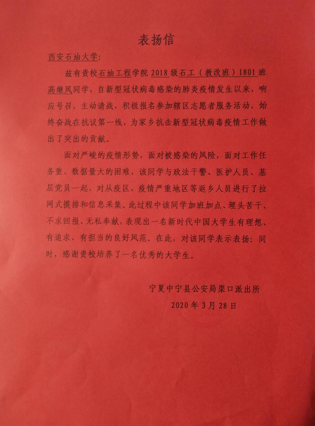 2018级学生高继凤同学,因在疫情防控工作中表现突出,受到了宁夏中宁县公安局渠口派出所的表扬。