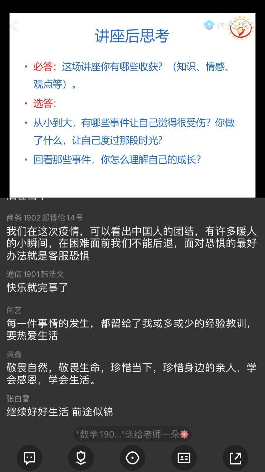 讲座结束时,肖老师请同学们思考并回答与成长有关的三个问题,同学们积极踊跃参与问答,纷纷表示通过讲座学会了如何面对丧失,并感受到了自己成长的力量。