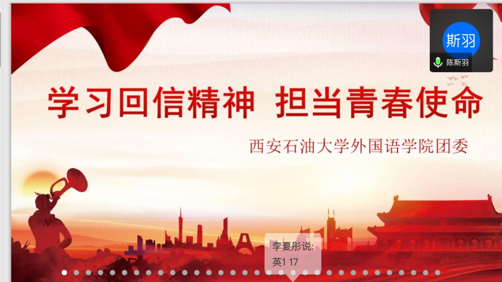 团委书记张帆老师和同学们也分享自己学习的心得说:“President Xi commends the young medical workers’ effort, the two letters have inspired and encouraged the college students, I hope all of you can learn from them and spearhead your own efforts despite difficulties in the battle against the novel coronavirus.”