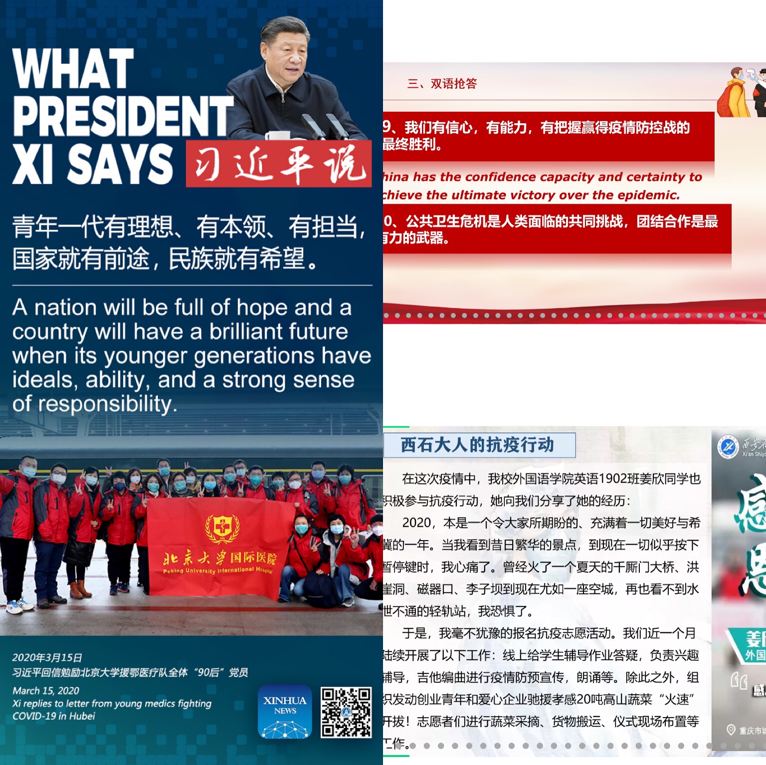 学生的回信和给北京大学援鄂医疗队全体“90后”党员回信精神双语版的学习、习近平总书记在抗击疫情期间金句双语学习以及双语抢答环节三部分展开。