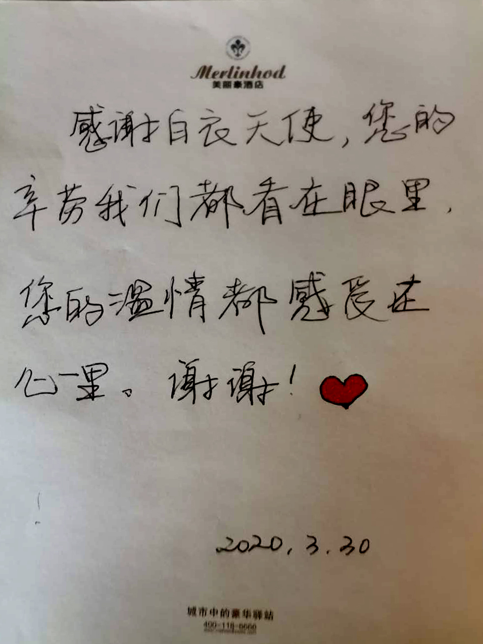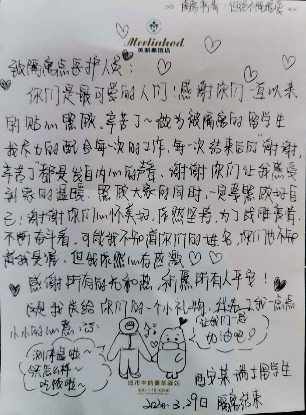 当我们每次拖着疲惫的身体回房间时,看到多封暖心的感谢信,信中表示我们工作很辛苦,对我们衷心的感谢,期待我们也平安而归,瞬间心暖,再累也值得,我想这是对我们最大的安慰和鼓励。看着一位位的隔离期满的人员笑容满面的离开,我们也算是心愿以偿,一定不负校医院院领导的重托,全力以赴地战胜疫情,期待疫去花开,大家生活平安健康,我们平安而归。