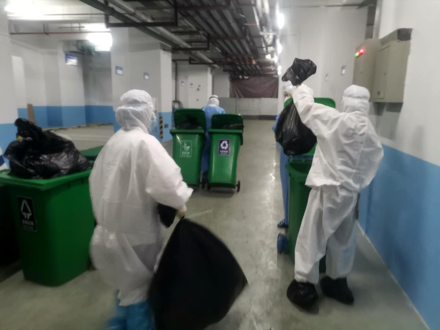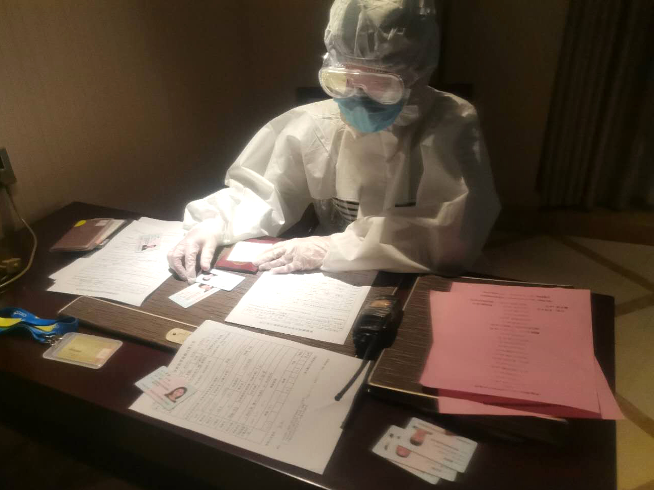 2020年4月1日晚,我们向往常一样迅速穿好防护服进入隔离区开始夜班的工作。接班后首先要通知当天夜里需要解除隔离的人员,告知他们收拾好行李,等待解禁时间到来,把他们带到安全通道,消杀完毕,办理解禁手续,看着他们平安的回家,大家心里也很欣慰。每天夜里11:00,我们需要把将近20个楼层的垃圾,全部装袋运送到楼下。夜班组多数是女孩子,看着楼下堆积如山的黑色袋子,望着姑娘们坚强的身影,心中总会不禁感慨,只要我们齐心协力,一定会疫去花开,抗疫胜利。凌晨1:00以后,将会有很多境外回国的人员被指挥中心送来,对这些人员和他们的行李进行消杀后,开始登记每一位隔离人员身份信息,记录航班号、座位号,并且询问一些病史,有没有发热、气促、咳嗽等等,测完体温后将他们按照国籍分配到不同的楼层。遇到高峰期,每晚通常可以收入几十人次。每次到后半夜的时候,已连续工作4-5个小时,又渴又累又困,由于防护物资的紧缺,我们都能默默的忍耐着口渴,避免上厕所,以免造成防护物品的浪费。没有任务的时候大家抓紧时间休息,桌子、沙发、地板都是我们休息的地方。就这样,一直到第二天早晨8:00交班迎接新的一天。