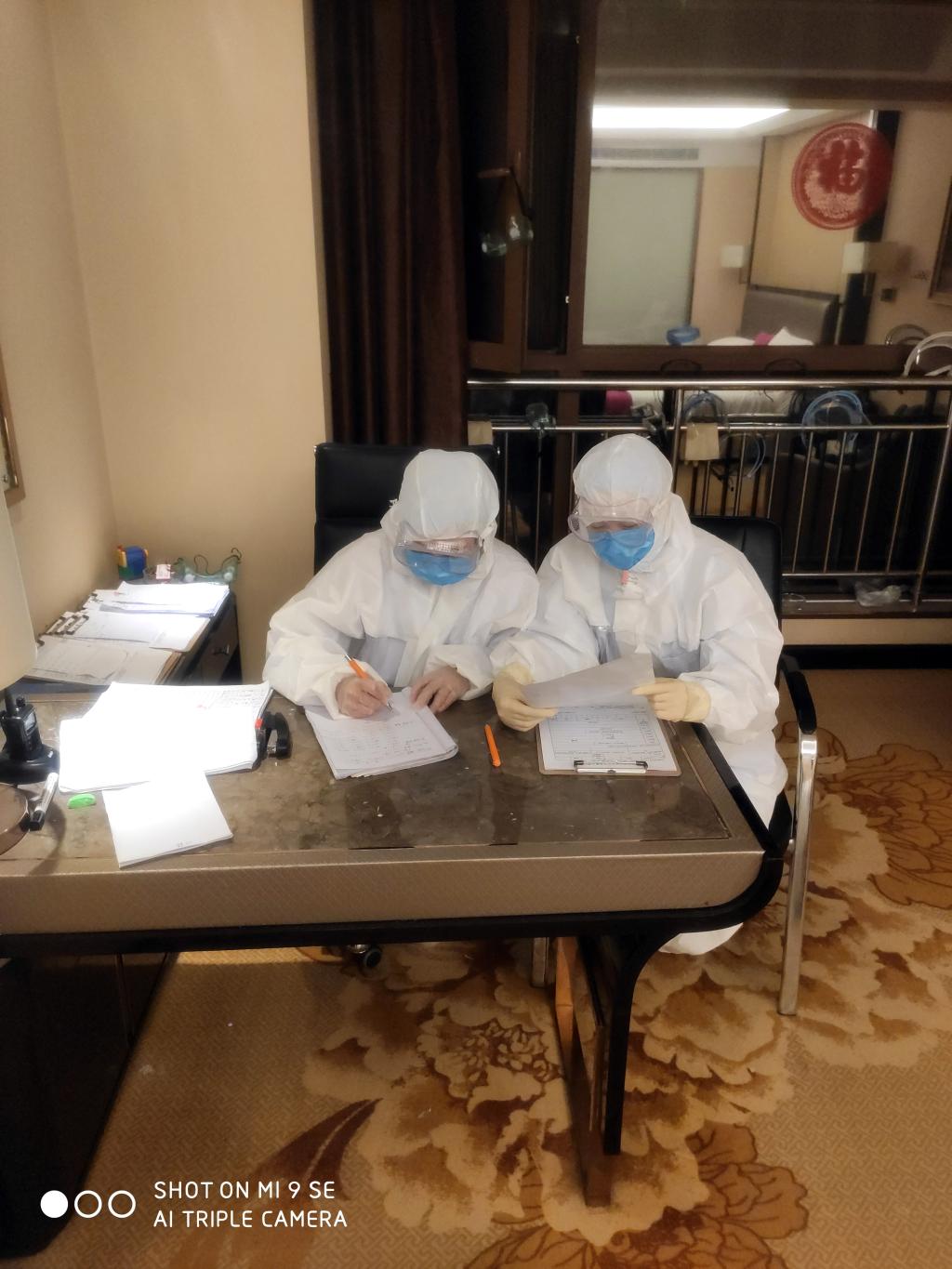 3月22日早上发餐时, 据了解在集中隔离的人员中有位身患高血压,心肌梗塞以及脑梗塞的病人,一直有服药时,且近期药品快没了,而且担心会因旅途劳顿而致其不适,目前7人的医疗组里内科专业的医生只有我和姚刚,我们发挥了专业特长,耐心的询问并记录他的既往病史及服药史,及时与其配备所需药品,并在不影响他们休息时,随时电话或当面沟通他的现状,让他在隔离期内不会因为自己的疾病而影响他的心情。中午我和姚刚在隔离区内上班时,突然接到工作组通知,此人于午饭后,突然出现眩晕、头痛等不适,我们立即跑去查看,因手边无任何医疗器械,只能一边询问一边安抚患者的烦躁情绪,并通过上级工作组紧急协调来一个血压计,耐心问诊及粗略检查后才发现,因近期饮食单一,且无法保证足够的活动量,便秘明显,而中午如厕时出现的短暂性血压升高所致,立即通过工作组联系酒店调整其为特殊餐,并告知其他个人应该注意的事项,每天至少一次问有无病情变化及情绪的波动,以保证其安全平稳的度过隔离期。过后他拉着我们的手说:“你们真的是很辛苦,特别感谢你们这一段时间的照顾”对着我们的工作人员深深地鞠了一躬,当时我瞬间湿了眼眶,因为我感受到的是国家的包容和民族的凝聚力,正因如此,才能使的我国渡过难关。