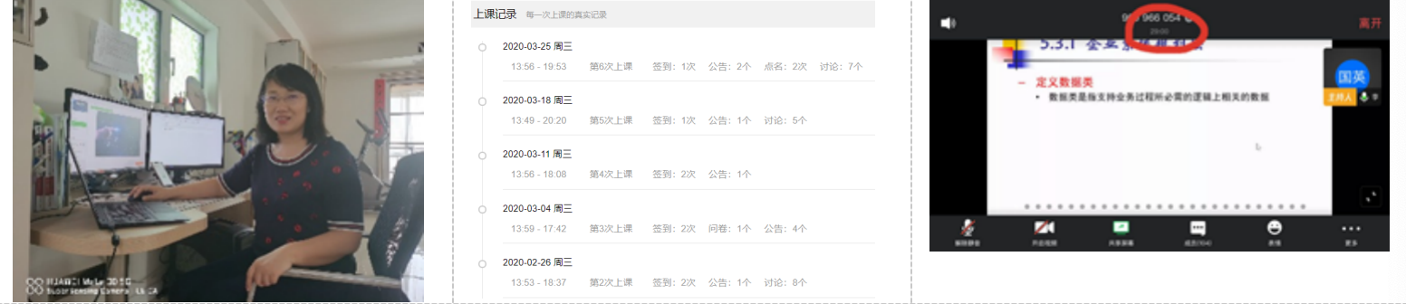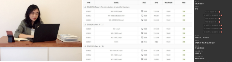 本学期常静老师主讲信管专业17级两个班《信息管理专业英语》和《信息系统分析与设计》两门课程。针对不同课程教学特点以及网络教学资源的情况,她分别设计了“课程管理平台+录制课程”以及“课程管理平台+网络优质教学资源”的教学模式。经过第一周的教学实践同时积极与学生交流教学效果,及时总结线上教学经验,调整原有教学方式为“课程管理平台+网络教学资源/自录课程+腾讯课堂”的教学模式,充分发挥各教学手段的优势:(1)利用课程管理平台对教学内容按课时进行整理与发布;每课时视频学习结束后布置涵盖当堂知识点的测验检测学习效果;发布批阅章节作业;学情的统计与分析。(2)依据网络资源情况选择网上优质教学资源或自录课程引导学生进行知识点的学习.(3)通过腾讯课堂定期对已学知识点进行梳理总结及作业点评。实现了在线教学的留痕管理,支持各类教学过程的回放,便于学生在网络不稳定时的学习和复习,保证教学质量可控;同时利用在线教与学中的各种互动数据的采集和分析,通过科学有效的过程性评价,激励和引导学生学习。除因课制宜及时调整教学方式外,常老师还结合抗击疫情契机,丰富线上教学案例对授课内容进行精心设计。针对疫情期间大量新闻报道知名学术期刊发表病毒研究成果,引导学生了解科技文献,熟悉科技英语的特点及重要性。同时鼓励学生结合课程知识将各地使用的疫情防控信息系统作为案例,思考信息系统与管理决策的关系,加深对课程知识点及信管专业的认知。