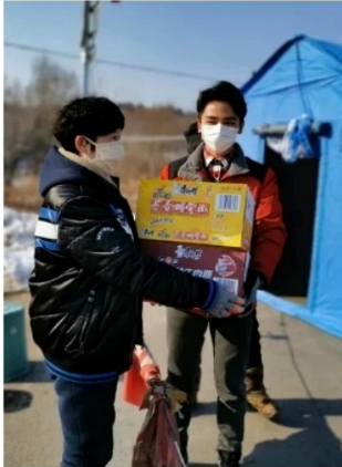 李一星(右一)为工作人员捐赠防疫生活物资