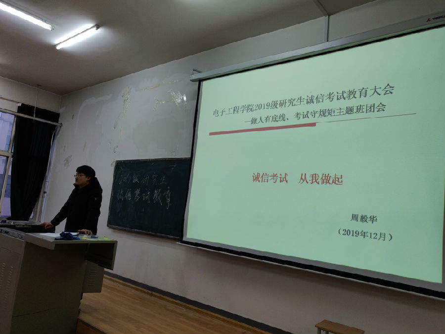 在鄠邑校区C3实验楼419教室举行研究生诚信考试教育大会,学生管理办公室主任周毅华老师主持会议,2019级全体研究生参加会议。