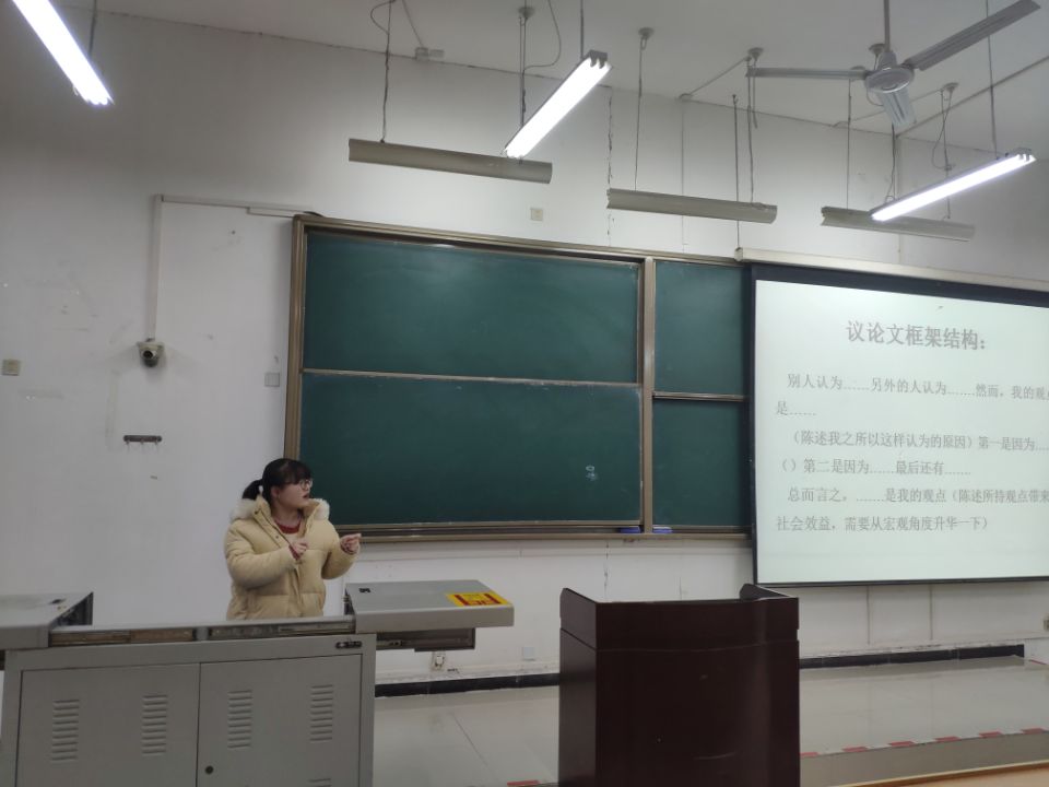 其次,薛洋同学根据个人英语学习和考试经验,从议论文、书信、图表和看图说话四个板块对同学们着重讲解了英语四级作文的写法,并基于近几年考试真题,结合自己撰写的英语作文对同学们进一步阐述。
