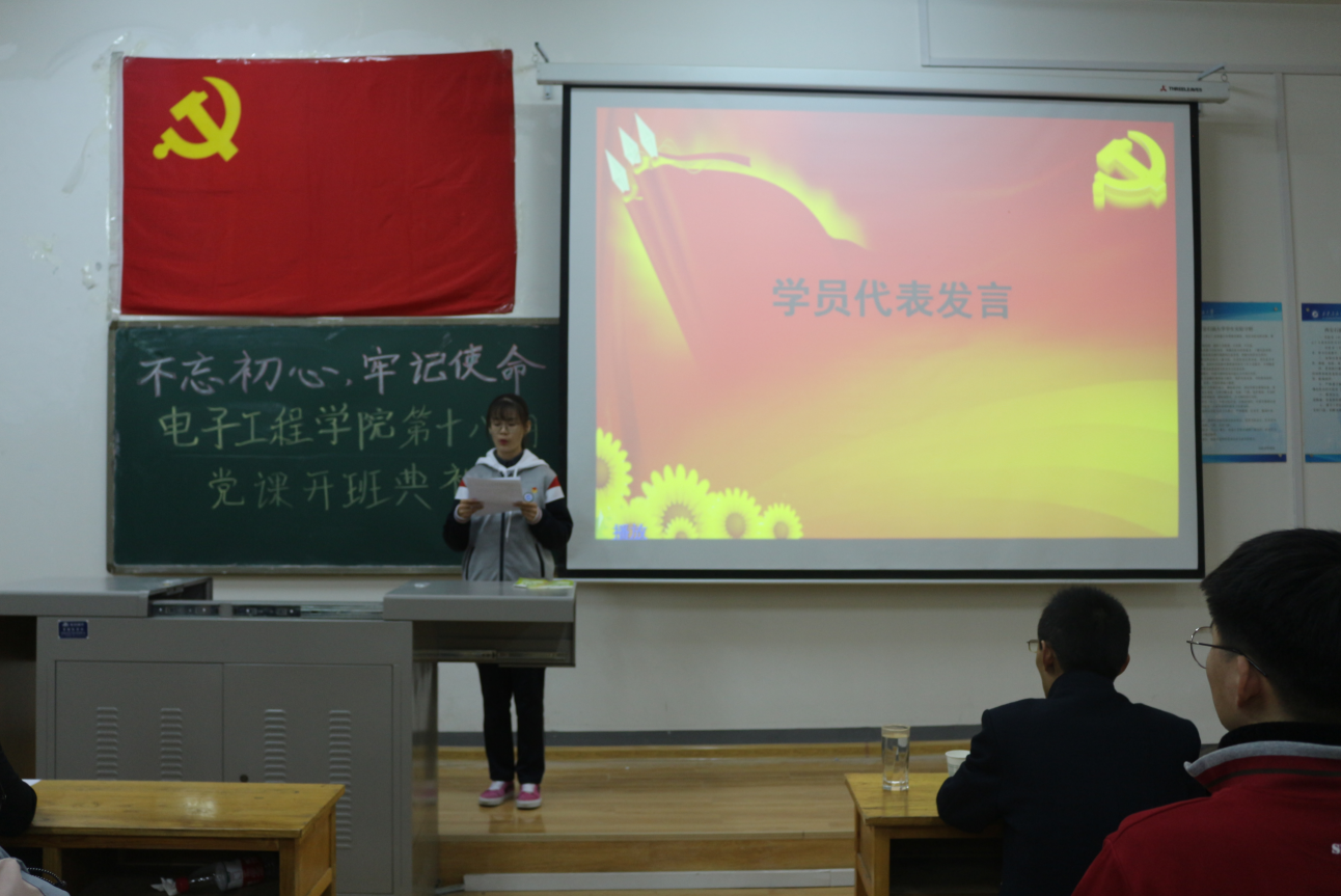 开班典礼在悠扬的国际歌声中正式拉开帷幕。首先,由上期优秀学员代表测控1802班的东怡同学和本期学员代表测控1903班刘东瓒同学进行发言,他们的发言充分展现了入党积极分子们良好的精神风貌,以及积极向党组织靠拢的决心。随后,由学生管理办公室主任、团委书记周毅华宣读了党课纪律要求,对参训学员做出了严格的要求。最后,由电子工程德州扑克