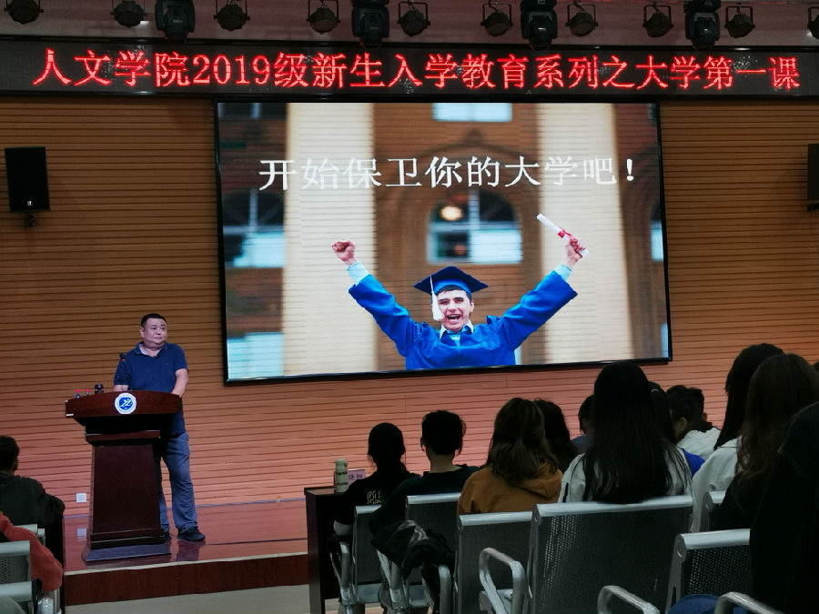 于9月26日晚组织2019级全体新生在人文经管楼118多功能报告厅开展了新生入学教育会——大学第一课,本次会议邀请了就业指导中心副主任樊晓旭老师为大一新生做精彩分享,人文德州扑克