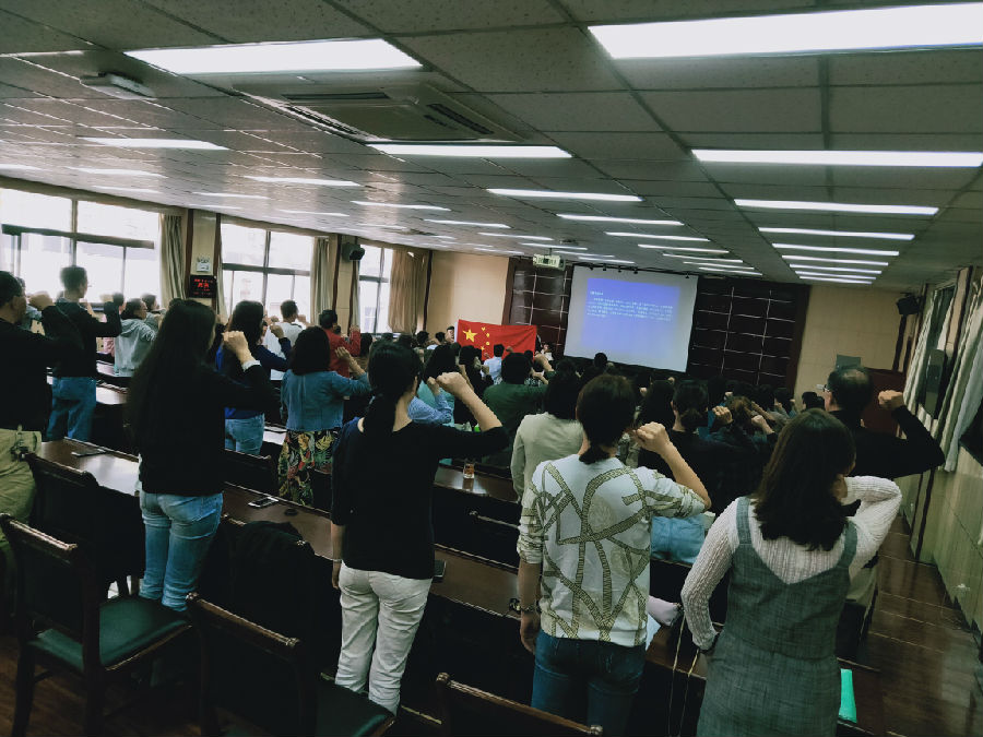 领导、全体教职工110余人全体起立,右手举拳,面对国旗庄严誓言,郑重承诺履行教师职责,牢记人民教师职业初心与光荣使命。通过宣誓活动,全体教职工进一步提升了服务国家、献身教育的思想意识,增强了作为一名人民教师的职业荣誉感和社会责任感。