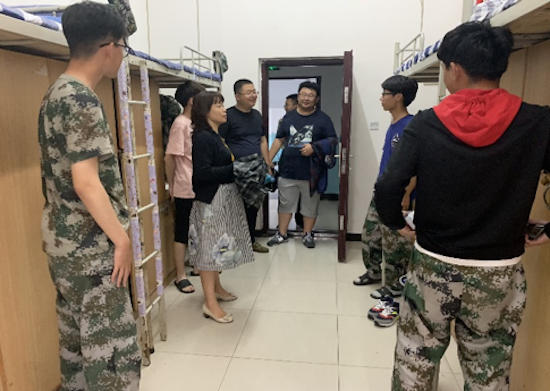 2019级新生,党委副书记赵海涛、学生管理办公室主任刘冰、2019级辅导员老师齐基、王晓天的陪同走访。