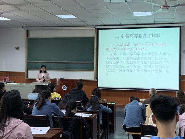 朱海娟副教授,毕业于西北农林科技大学获博士学位,西北大学博士后,美国路易斯安那大学拉法叶分校访问学者,报告的题目为《中美高等教育比较研究》。报告主要内容对比了中美高等教育在办学理念、教育目标、教学组织方式的差异,并通过学术诚实教育、教学设施配置、毕业典礼等细节,指出了美国高等教育中普遍存在的开放、以人为本、注重综合素质培养、教学方式灵活等特征。