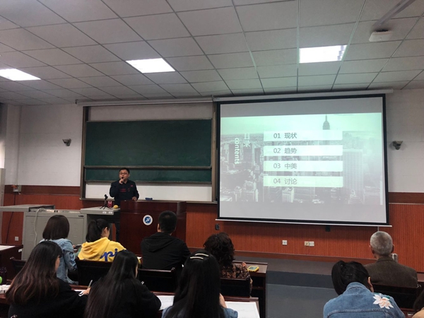 陈丁博士,毕业于西安交通大学获博士学位,美国堪萨斯大学访问学者,报告题目为《多棱镜下的美国》。报告主要内容从社会、教育、民生、环境等多个角度,展示、分析当今美国的发展现状;通过对比美国十年间的变化,探讨了未来美国的可能发展走势;并对中美间未来的关系特征提出自己的判断,并对计划前往美国学习、访问、工作的听众,提供了个人建议。