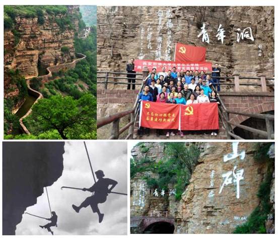 红旗渠要从陡峭如切的狼牙山悬崖绝壁上穿过,必须凿通一条长达600多米的隧洞,但坚硬如钢的石英砂石,一锤下去只能留下一个斑点。林县县委当时决定抽调300名优秀青壮年,经过17个月奋战开凿,终于征服天险,完成了红旗渠的咽喉工程,此隧洞故得名“青年洞”。全体参训学员从红旗渠入口处拾级而上,穿过鹰咀山、虎口崖,沿着红旗渠堤坝,向“青年洞”一路进发。沿途看到当年全靠人力推动的独轮手推车雕像群,为了保证工程质量立下的责任界碑,人工用一千公斤炸药在太行山上劈开的缺口……大家感慨万千。徒步四公里后,全体参训学员来到红旗渠的咽喉工程“青年洞”口,回想着常年顶风冒雪,抗严寒战酷暑,修建红旗渠的艰苦岁月,感受着时任林县第一县委书记杨贵、红旗渠设计师吴祖泰烈士等事迹洗礼,全体参训学员心潮澎湃,为修建红旗渠过程中突出表现的“自力更生、艰苦创业、团结协作、无私奉献”精神而深深折服。