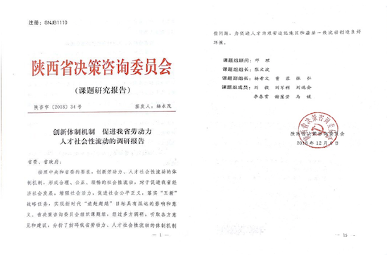 经管院刘毅博士主笔,李春霄博士参与撰写的《创新体制机制 促进我省劳动力人才社会性流动的调研报告》,由陕西省决策咨询委员会以决策咨询报告的形式(陕咨字[2018]34号)报省委、省政府,得到省委、省政府的重视。