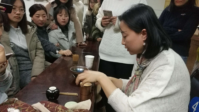 任轩老师结合唐宋时期的诗词,深入剖析古人品茶、鉴茶的视野,从采茶、制茶、泡茶等多个角度将日本茶道和中国茶艺进行对比,阐释了不同国家茶文化的内涵。最后,任轩老师现场进行了茶艺展示表演,赢得同学们阵阵掌声。