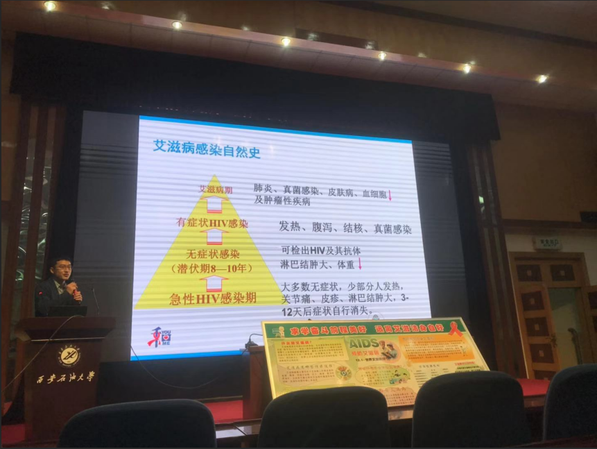 讲座通过大量实际数据向同学们展现了全国大学生感染艾滋病人数上升的局势,强调了高校开展艾滋病防治宣传教育的重要性和必要性等,同时结合临床病例与相关视频,全面讲解了艾滋病的感染自然史、基本症状、治疗方法以及针对此疾病我国目前开展的预防检测方式及免费治疗政策,并指出纠正了蚊虫叮咬、日常生活正常接触会被传染艾滋病的误区,使学生们更深入地了解了什么是艾滋病,艾滋病的传播渠道,艾滋病的广泛性以及艾滋病的预防等重要的知识,并引导同学们科学、理性的认识和对待艾滋病及感染人群。