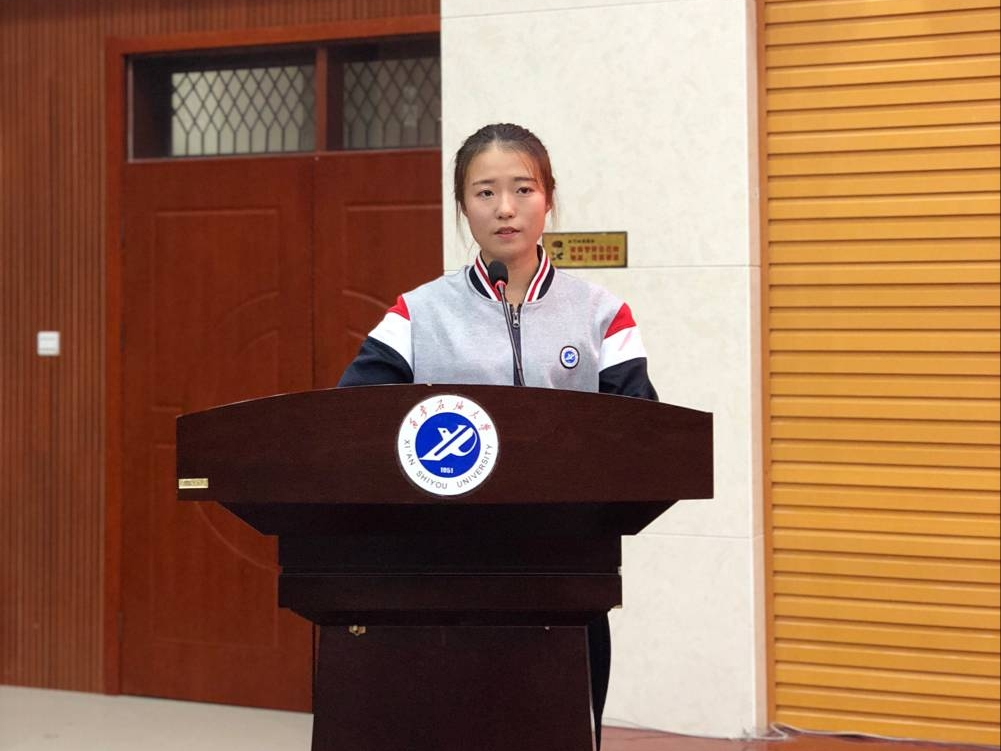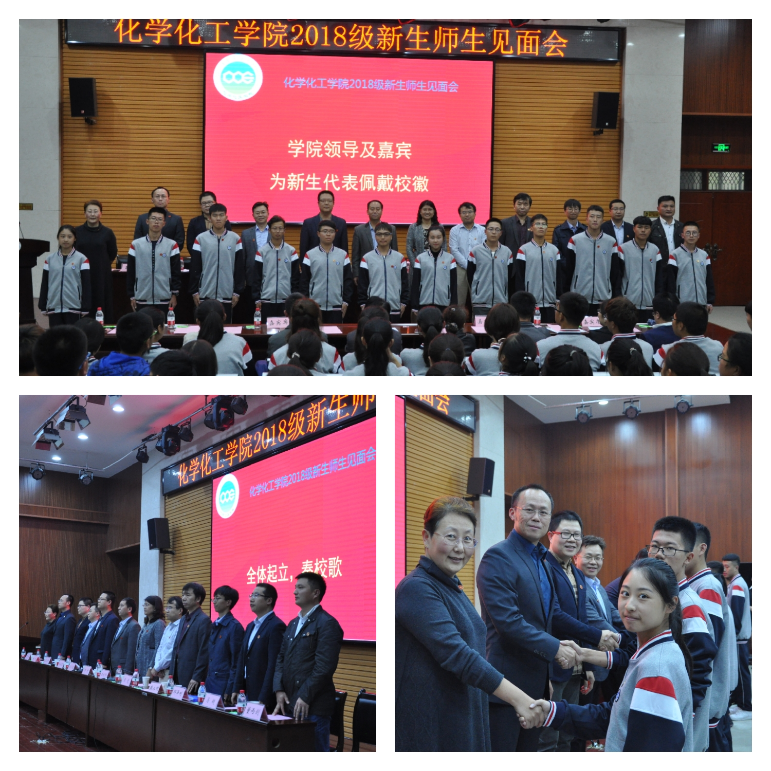 校徽。校徽佩戴仪式使得师生见面会更具有仪式感,让新生们更加以西石大人的身份而自豪、荣耀。应化1803班杨蓉同学在见面会上做了新生代表发言。