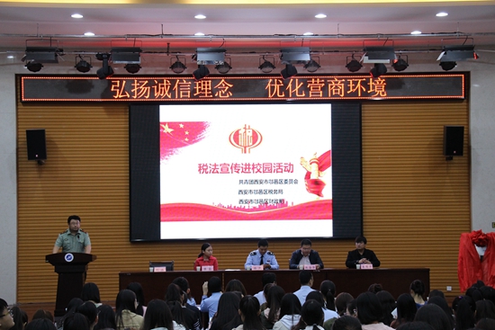 区税务局总经济师徐凯介绍由西安市团委、税务局、财政局联合发起的税收宣传进校园的活动概括,并宣传从早抓起,在学生中倡导懂法、知法、守法、学法,鼓励学生争做税收宣传员。