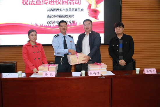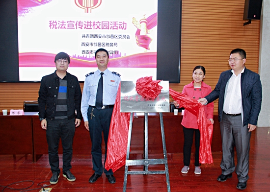 书香校园系列活动之税收普法基地揭牌仪式在经管人文楼118举行。鄠邑区团委副书记陈睿,区税务局总经济师徐凯,区财政局、区税务局青春梦之队成员代表以及经济管理德州扑克