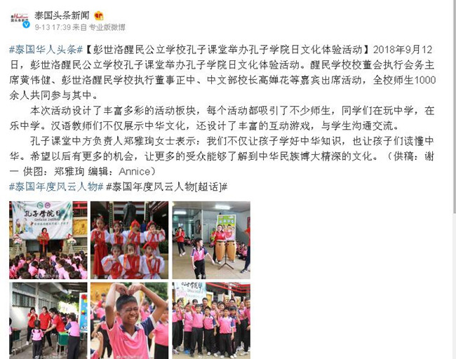近日,人文德州扑克 汉语国际教育专业17级研究生在泰国醒民德州扑克 孔子课堂举办了孔子德州扑克 日活动。这是由并国家汉办、孔子德州扑克 发起,世界各地孔院同时举办,为纪念孔子德州扑克 建设发展的重要庆祝活动,其目的是宣扬中华文化,推广汉语教育。此次活动被泰国华人头条网报道,受到了当地校领导和学生们的一致认可和高度评价。