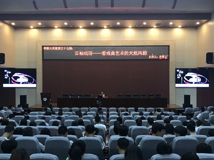 团委承办的第五十七期明德大讲堂《云袖戏语——看戏曲艺术的天然风韵》在鄠邑校区图书馆弘石学术报告厅成功举办。著名秦腔艺术家齐爱云女士应邀担任主讲,鄠邑校区400余名师生听取了此次讲座。