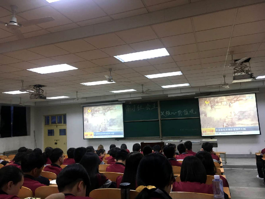 在设计1703史宗琦和物理1701李晓芳两位同学的带领下,中文1701班邝丽华等三名同学进行了精彩演讲,带领与会学生更深入的了解社会主义核心价值观的内涵。接下来,在知识竞赛的环节上,同学们进行分组分区、互相配合,通过“听歌传花”的形式来选择回答问题的同学,气氛相当活跃,极大的提高了在场同学的积极性、增强了活动的互动性,充分展示了当代大学生的文化素养和竞争意识。最后,活动在以视频的方式展示当代大学生该如何践行社会主义核心价值观中拉上了帷幕。这次活动,使同学们充分认识到中国梦的实现有赖于我们青年一代,鼓励全体团员不忘初心,继续前行。