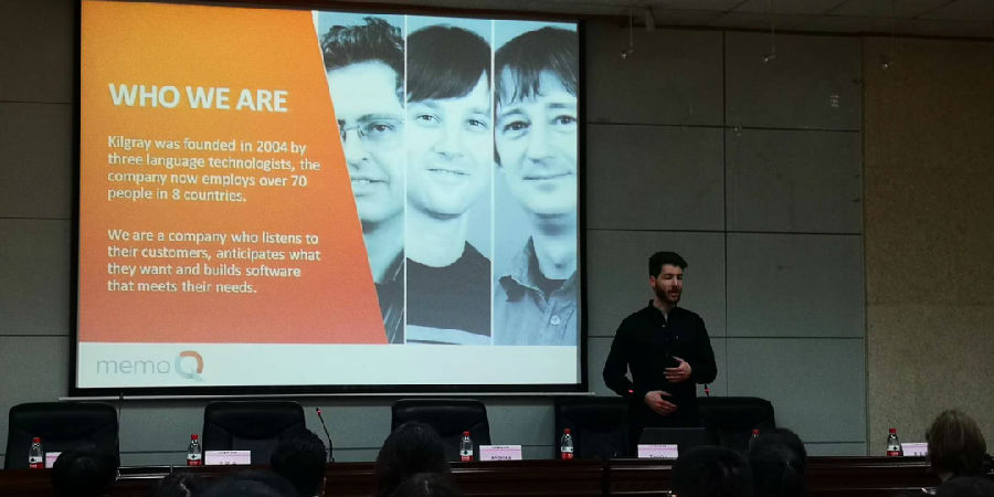 院长于艳英致开幕词,对各位嘉宾的到来表示热烈的欢迎。Kilgray公司联合创始人,memoQ创意总监Gabor Ugray和渠道总监Tomas Ritter分别对memoQ的开发理念和服务器技术进行了介绍,享誉全球的翻译软件培训师Angelika Zerfass就翻译项目创建、术语管理和质量控制等作了十分详实的报告。上海一者信息科技刘宁赫经理对基于memoQ, Trados 的Tmxmall语料对齐技术、在线翻译、语料库管理等进行了图文并茂的释解,并耐心地对与会者提出的问题进行了深入浅出的解答。