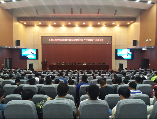 “‘书香校园’第二届读书节活动方案”,张楠老师现场对大家讲解了本次“书香校园”建设的目的和意义,要求每一名同学能够坚持每一天阅读书籍,分享心得,提升自我!然后,孙会珠老师结合《BP(英国石油公司)世界能源展望2017版》与我国目前石油石化行业实际情况,对大家分析了能源行业未来由高碳——中碳——低碳的发展趋势,认为石油与天然气在未来依旧是世界能源格局中的重头戏,勉励同学们积极努力学习,不要辜负每一天。最后,张建高老师对本次大会做总结,希望每一位同学认真反思自己上一学期的成绩情况,结合本学期德州扑克
