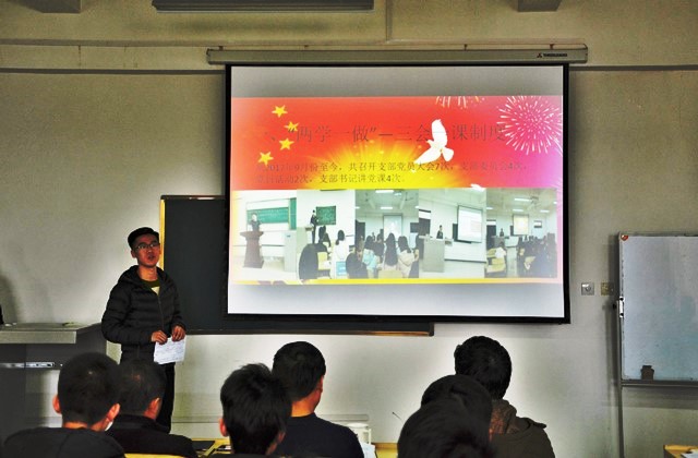 朱老师首先对述职汇报的相关要求进行了说明;接着,按照抽签顺序,第五学生党支部书记赵东睿、第八学生党支部书记张学聪、第四学生党支部书记高伟、第九学生党支部书记赵勃、第十一党支部书记解聪和第二学生党支部书记李鹏钺分别作了述职汇报。汇报内容主要围绕支部基本情况、支部的建设(组织建设、思想建设、制度建设、作风建设等)、支部特色活动与创新、问题与不足、计划与展望等方面展开。