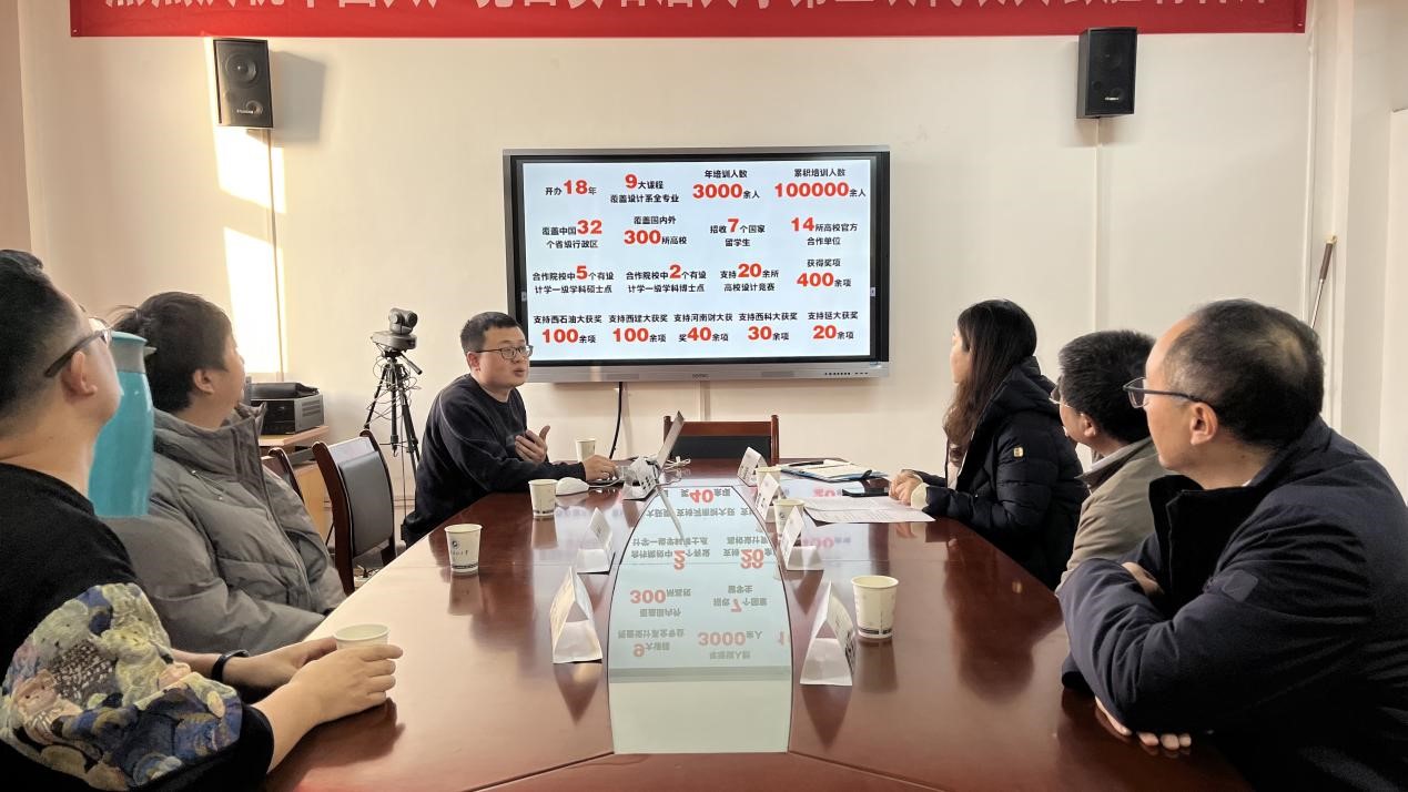 党委书记余小勇、党委副书记盛丹、设计系主任曹盼宫、学工办主任付强与西安美果设计创始人耿金、市场总监李永东、品牌总监牛奔等出席签约仪式。会议由盛丹副书记主持。