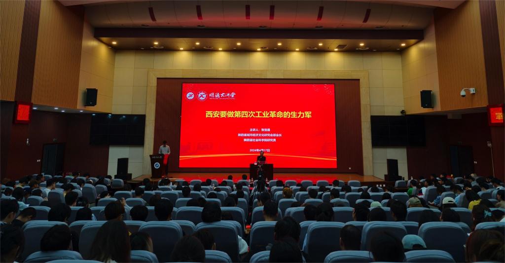 张宝通结合自身研究及实践经历,从世界新质生产力的四次飞跃、西安第四次工业革命的优势、“一带一路”助推西安工业革命三个方面作了深刻又详实的报告。他指出,当前世界已发生了三次工业革命,每次工业革命都是生产力质的飞跃,从机械化到电气化再到信息化,目前正在经历第四次工业革命,即由新质生产力引领下的智能化时代。他强调,当前西安作为国家综合性科学中心和科技创新中心“双中心”城市,在科学教育、高新技术、装备制造、电子信息、国防科技等方面具有独特的优势,希望广大同学能够积极努力学习专业知识,不断提升自身综合素质能力,在未来积极投身陕西经济建设,为我省在第四次工业革命智能化发展的过程中发挥青年人应有的作用,进一步争当能吃苦、敢担当、有理想、肯奋斗的新时代三秦好青年。